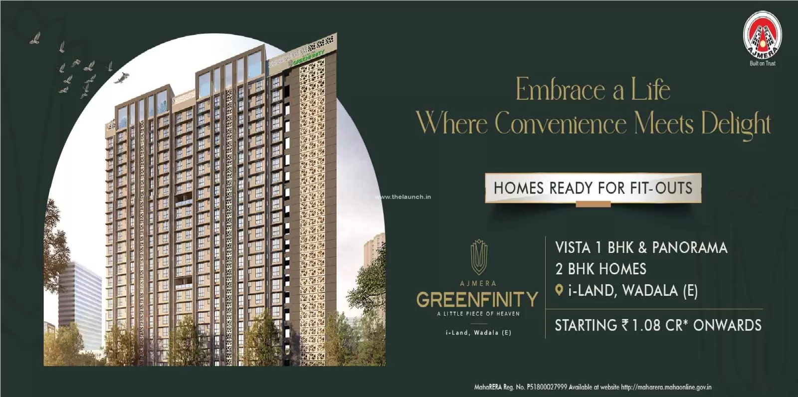Ajmera Greenfinity by Ajmera Group is a premium residential development located in the lush and well-connected BHAKTI PARK, NEXT TO IMAX, WADALA (E), MUMBAI. Ajmera Greenfinity is spread across acres. Ajmera Greenfinity features 1 magnificent towers that rise floors high, offering spacious and thoughtfully designed 1 BHK 2 BHK 3 BHK residences. Each home at Ajmera Greenfinity WADALA is crafted to provide a fine balance of comfort, elegance, and modern lifestyle for discerning homebuyers seeking the perfect urban retreat.