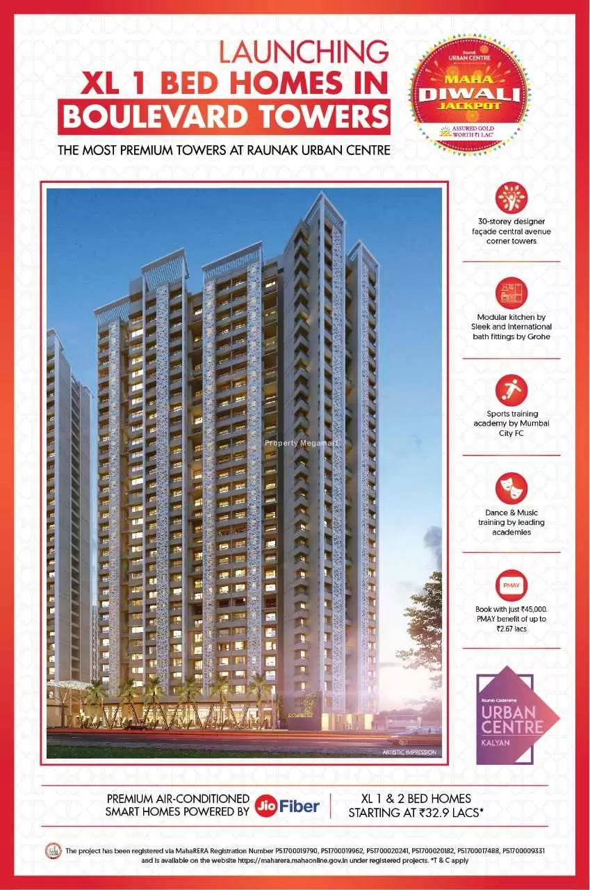 BOULEVARD TOWERS RAUNAK KALAYAN by Raunak Group is a premium residential development located in the lush and well-connected Khadakpada Aadharwadi Wadi, Kalyan West, Beyond Thane. BOULEVARD TOWERS RAUNAK KALAYAN is spread across acres. BOULEVARD TOWERS RAUNAK KALAYAN features 1 magnificent towers that rise floors high, offering spacious and thoughtfully designed 1 BHK 2 BHK residences. Each home at BOULEVARD TOWERS RAUNAK KALAYAN Kalyan is crafted to provide a fine balance of comfort, elegance, and modern lifestyle for discerning homebuyers seeking the perfect urban retreat.