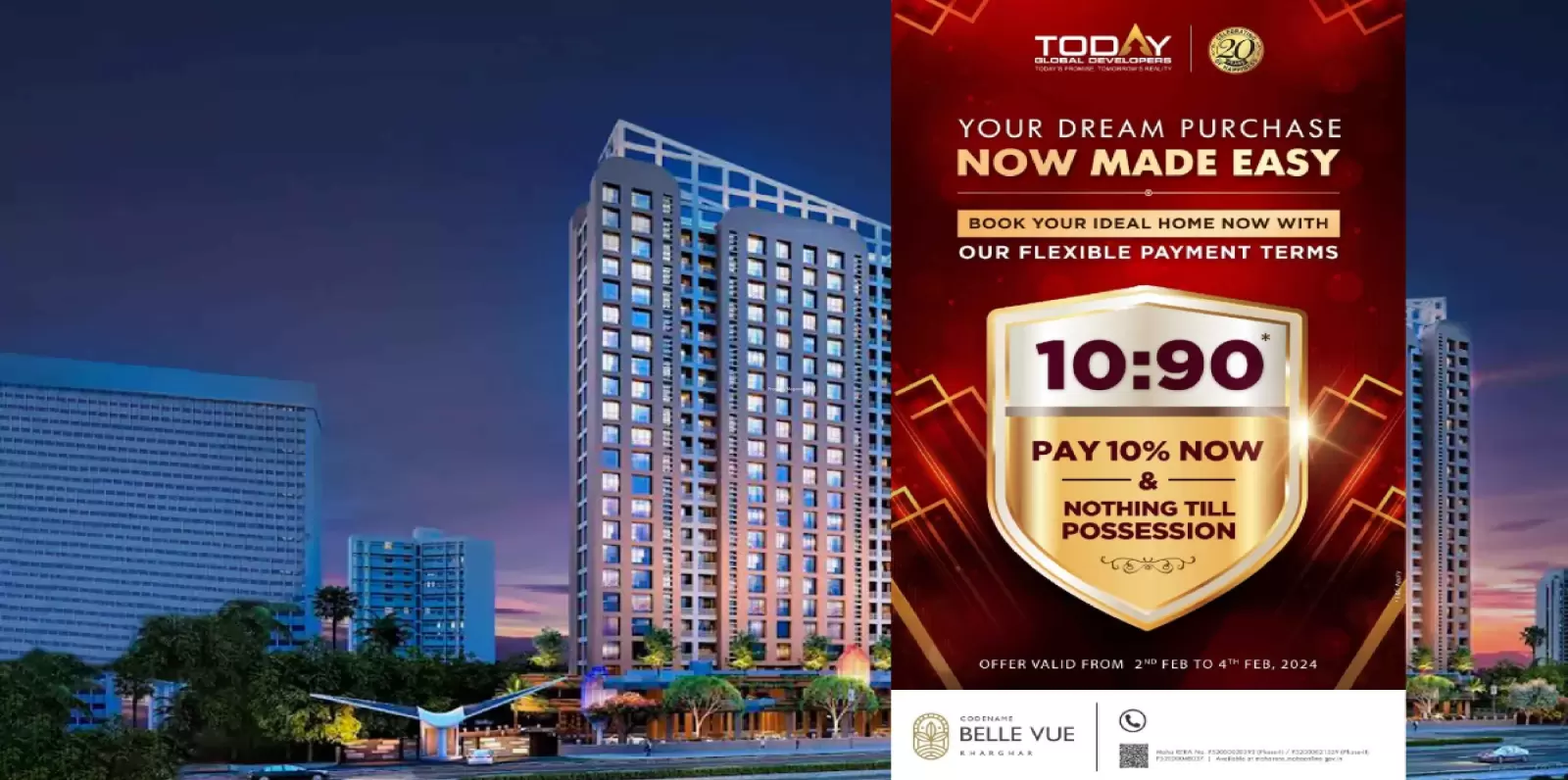 Codename Bellevue by Today Global is a premium residential development located in the lush and well-connected KHARGHAR. Codename Bellevue is spread across 9 acres. Codename Bellevue features 1 magnificent towers that rise floors high, offering spacious and thoughtfully designed 1 BHK 2 BHK 3 BHK residences. Each home at Codename Bellevue KHARGHAR is crafted to provide a fine balance of comfort, elegance, and modern lifestyle for discerning homebuyers seeking the perfect urban retreat.