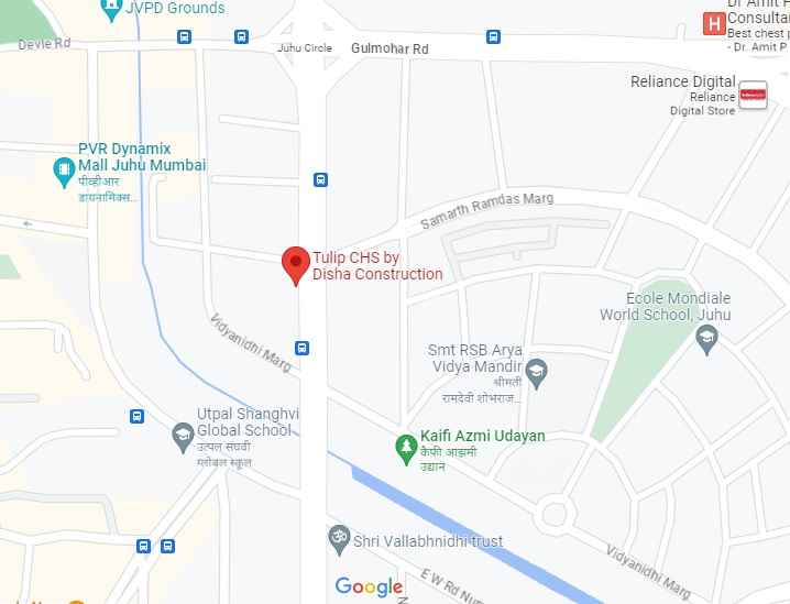 Strategically located in Juhu, Mumbai South West, Disha Tulip enjoys excellent connectivity to key parts of JUHU. It is well connected to top schools, hospitals, shopping complexes, and entertainment hubs.
