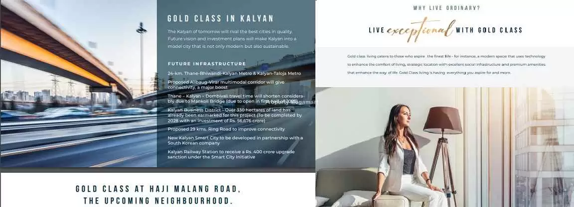 Strategically located in Kalyan East, Gold Class enjoys excellent connectivity to key parts of Kalyan. It is well connected to top schools, hospitals, shopping complexes, and entertainment hubs.
