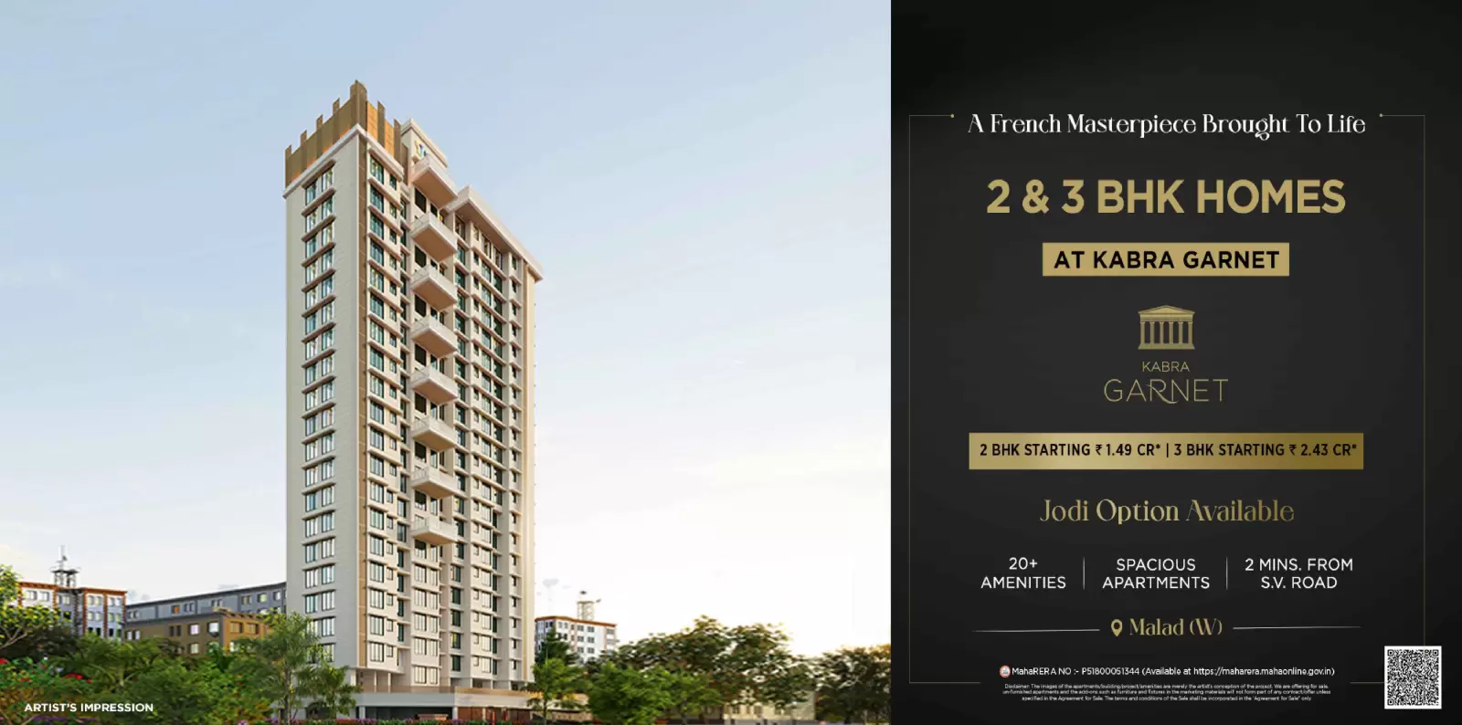 Kabra Garnet by Kabra Group is a premium residential development located in the lush and well-connected Kabra Garnet,Opp Mumbai Bank,Ramachandra Lane,Malad-West,Mumbai-400064. Kabra Garnet is spread across acres. Kabra Garnet features 1 magnificent towers that rise floors high, offering spacious and thoughtfully designed 2 BHK 3 BHK 1 BHK residences. Each home at Kabra Garnet MALAD is crafted to provide a fine balance of comfort, elegance, and modern lifestyle for discerning homebuyers seeking the perfect urban retreat.