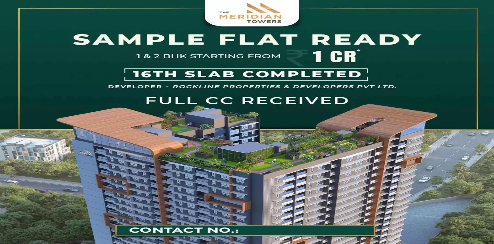 nities such as Gymnasium,Cafeteria,Power Backup,Swimming Pool,Intercom,Landscape Garden,Children Play Area,Multipurpose Room,Club House,Lift,Garden,Fire Prevention,Security,Parking,Shopping,CCTV. Every detail of Meridian Tower reflects ROCKLINE DEVELOPERS’s commitment to superior design, construction quality, and a sustainable environment. Homes are designed to ensure ample sunlight, cross ventilation, and panoramic views.