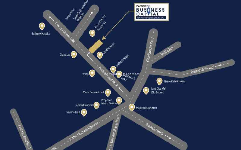 Strategically located in Thane West, Next to tiara mall, Gandhi Nagar, Passcode Business Capital enjoys excellent connectivity to key parts of Thane. It is well connected to top schools, hospitals, shopping complexes, and entertainment hubs.