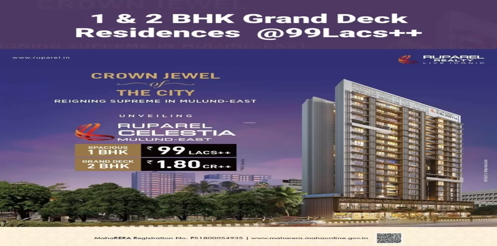 Ruparel Celestia by Ruparel Realty is a premium residential development located in the lush and well-connected Ruparel Celestia, 1st Floor, Ravi-Kailash CHS, Opposite Romell Vasanthi Navghar Rd, Tata Colony, Mulund East, Mumbai, Maharashtra 400081. Ruparel Celestia is spread across 0.18 acres. Ruparel Celestia features 1 magnificent towers that rise floors high, offering spacious and thoughtfully designed 1 BHK 2 BHK residences. Each home at Ruparel Celestia MULUND is crafted to provide a fine balance of comfort, elegance, and modern lifestyle for discerning homebuyers seeking the perfect urban retreat.