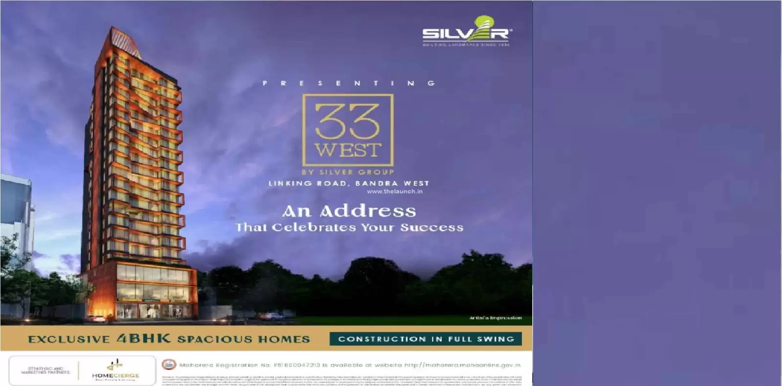 Silver 33 West by Silver Group is a premium residential development located in the lush and well-connected Bandra West, Western Suburbs, Mumbai. Silver 33 West is spread across 0.24 acres. Silver 33 West features 1 magnificent towers that rise floors high, offering spacious and thoughtfully designed 4 BHK residences. Each home at Silver 33 West Bandra is crafted to provide a fine balance of comfort, elegance, and modern lifestyle for discerning homebuyers seeking the perfect urban retreat.