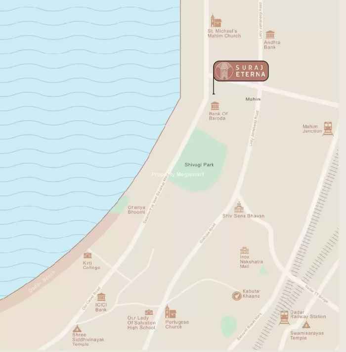 Strategically located in At Mahim , L j Cross Road 2nd lane , Mahim West, near conossa High school. Opp Garden colony., Suraj Eterna enjoys excellent connectivity to key parts of MAHIM. It is well connected to top schools, hospitals, shopping complexes, and entertainment hubs.